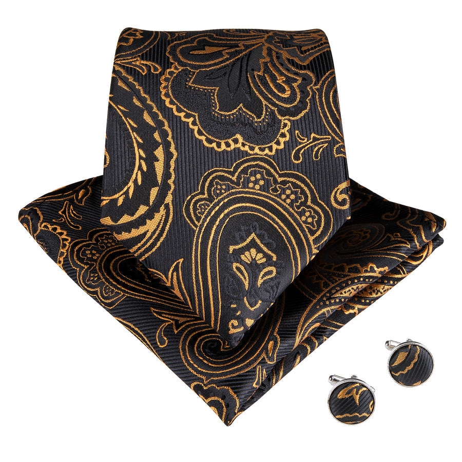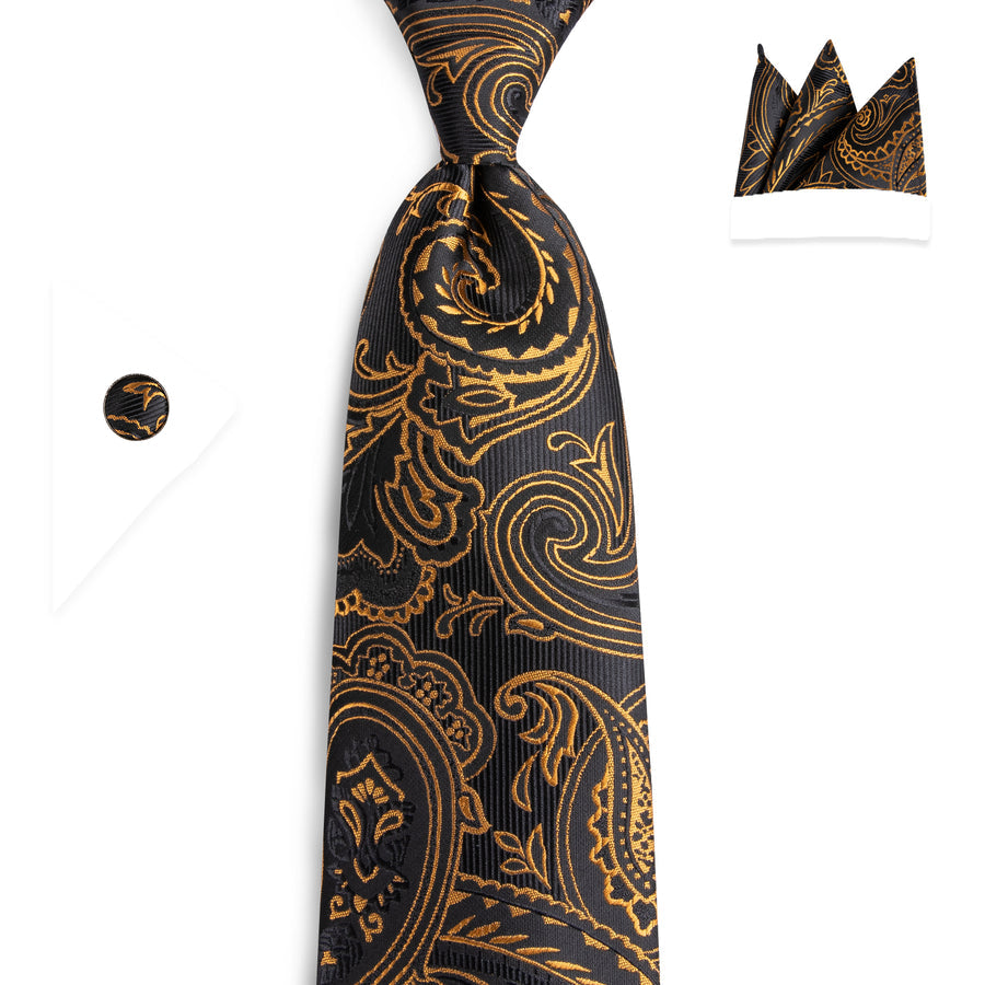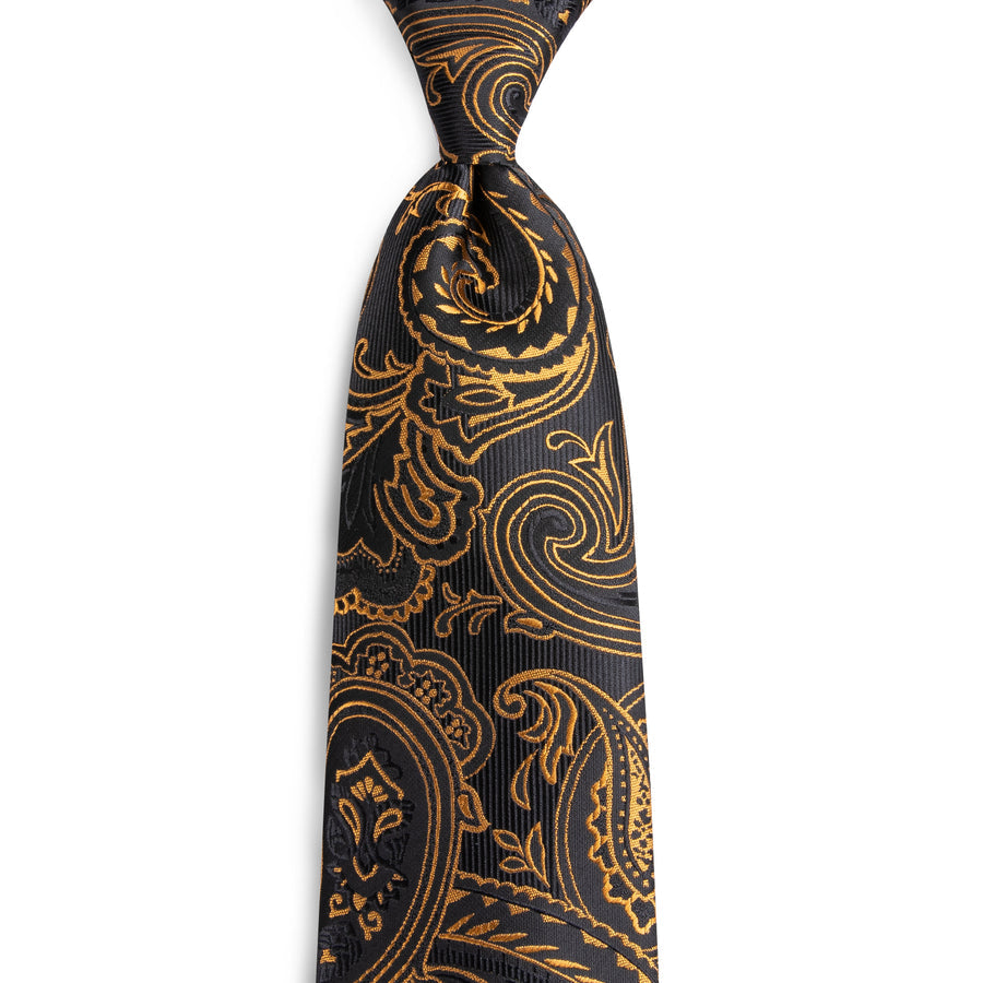 Black and Gold Paisley Silk XL Tie, Pocket Square and Cufflinks