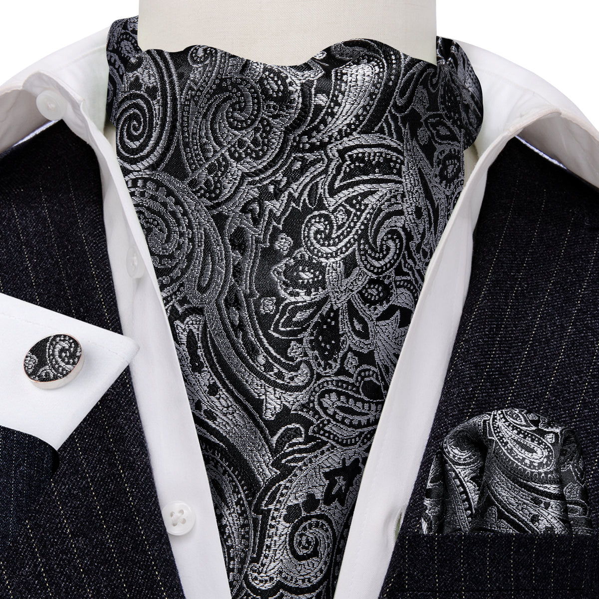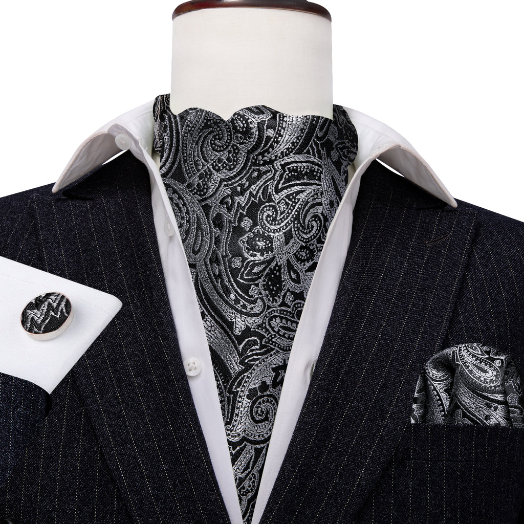 Black Gray Paisley Silk Ascot, Pocket Square and Cufflinks