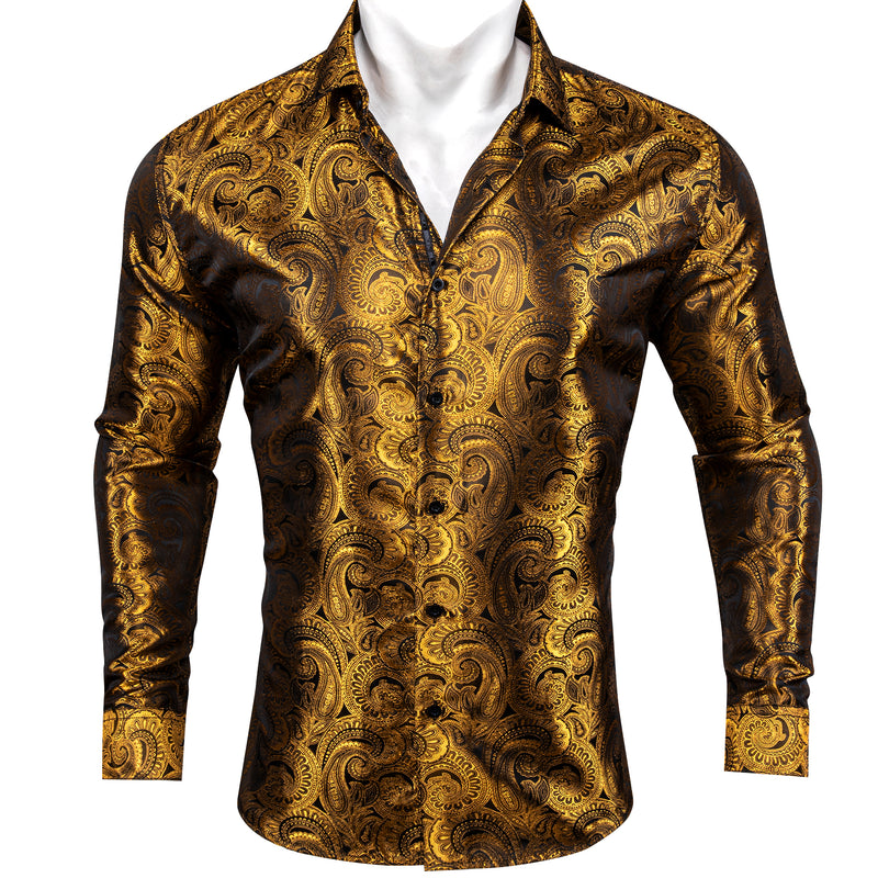 Brown Golden Paisley Pattern Silk Dress Shirt