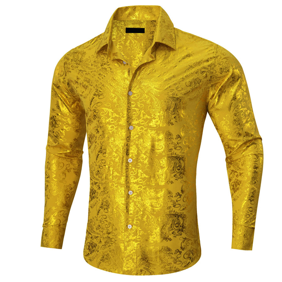 Gold Yellow Jacquard Floral Silk Dress Shirt