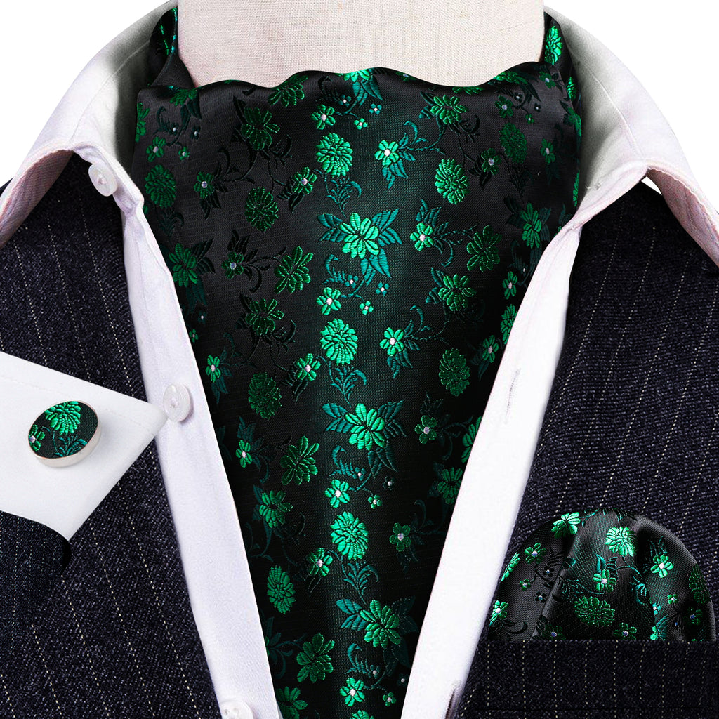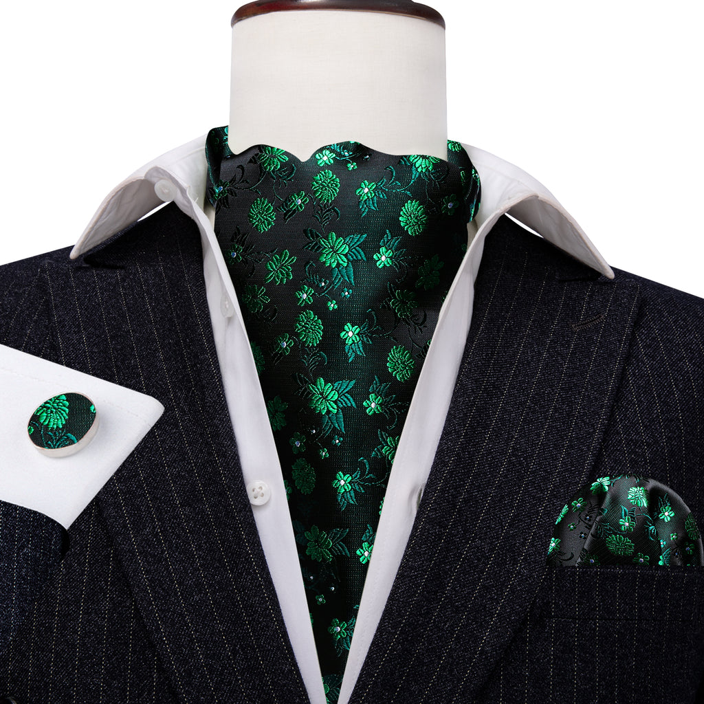 Green Black Flower Ascot, Pocket Square and Cufflinks