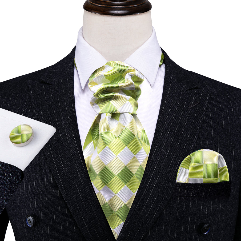 Green White Plaid Silk Ascot, Pocket Square and Cufflinks