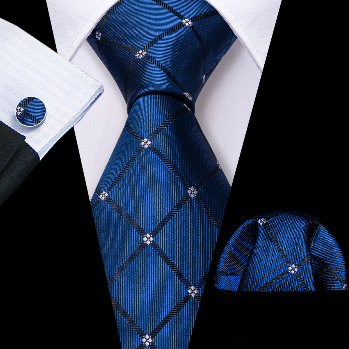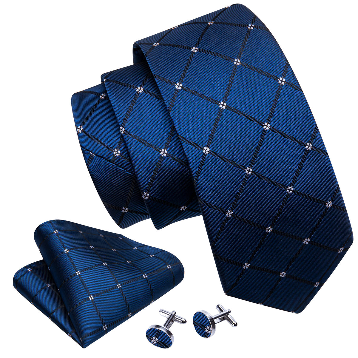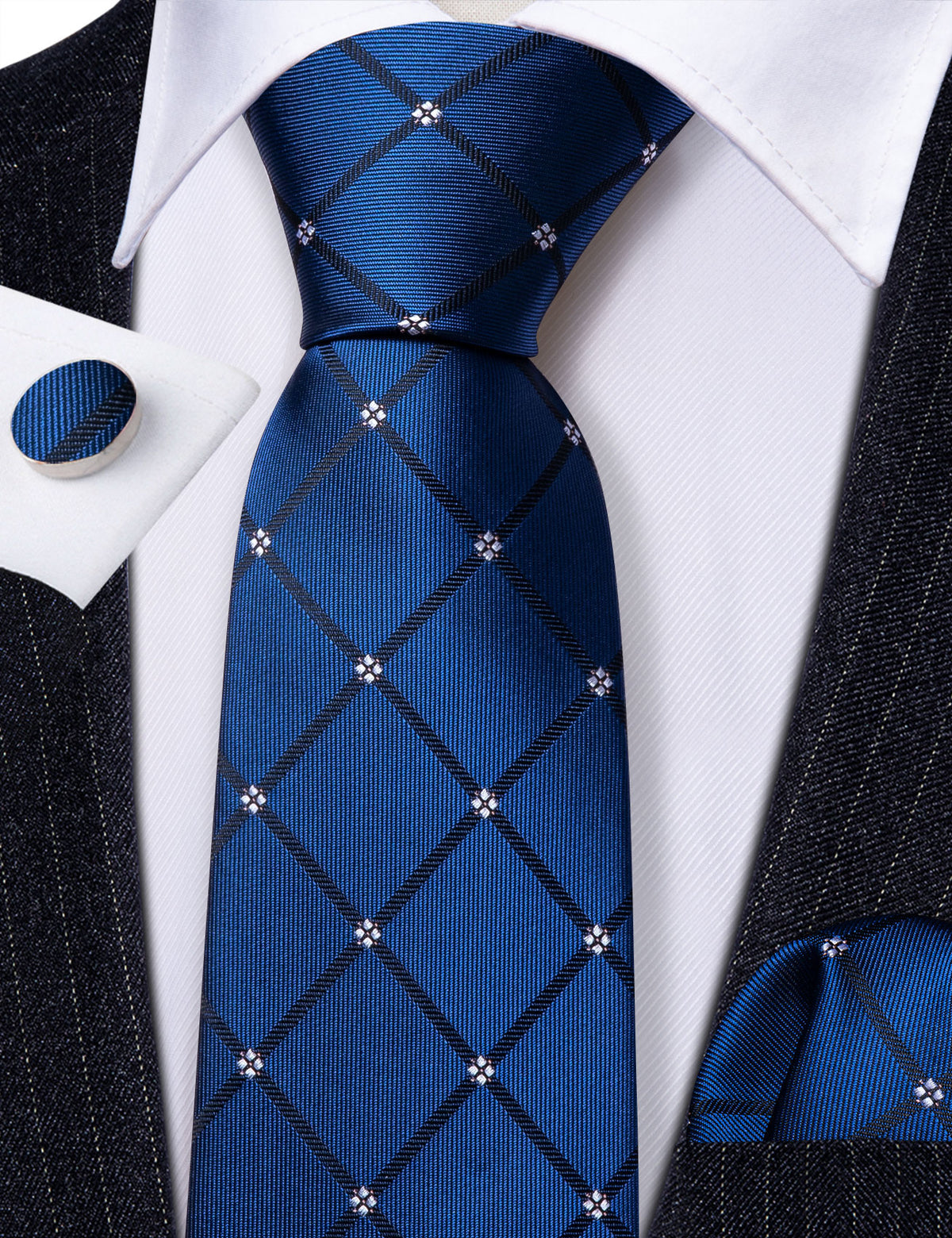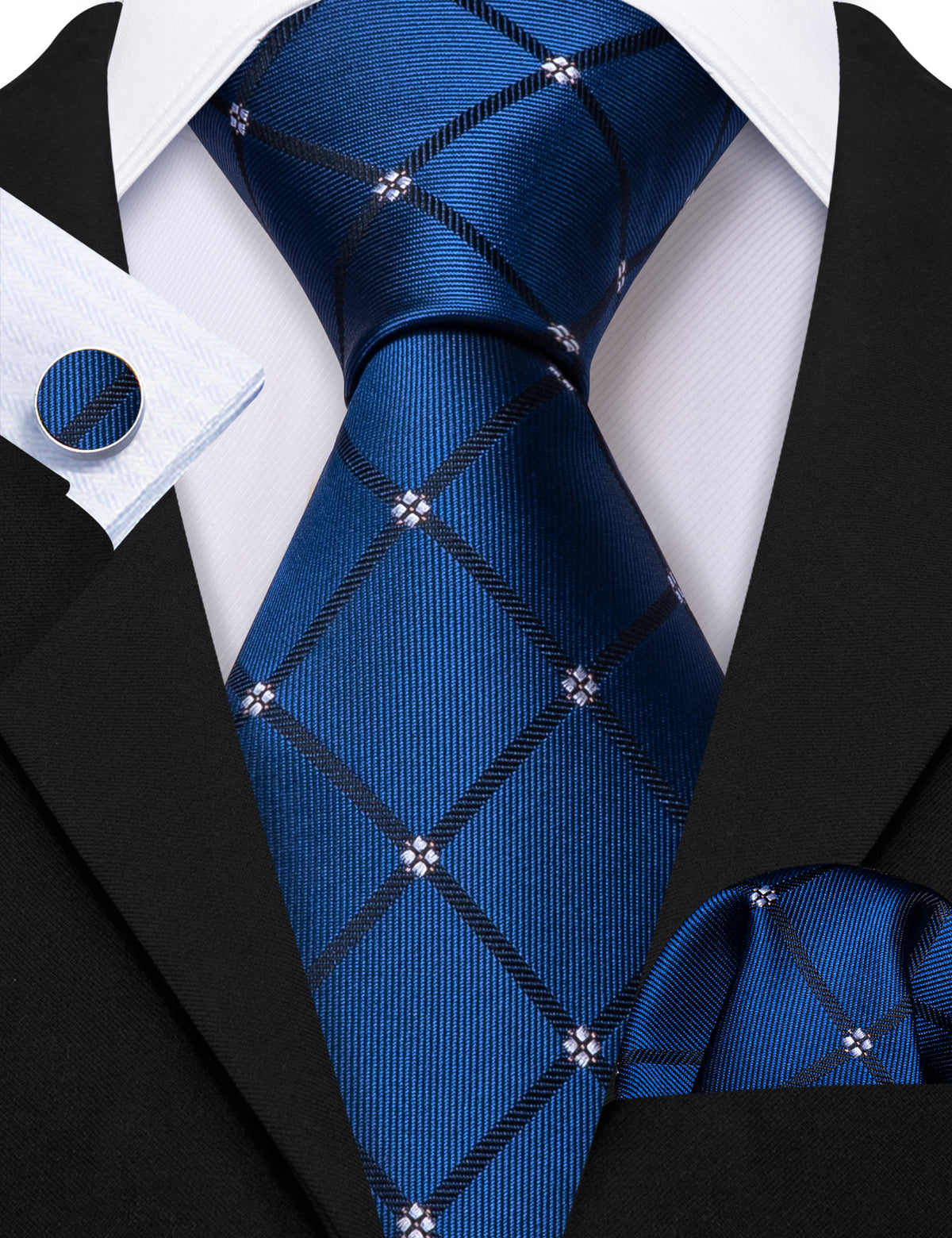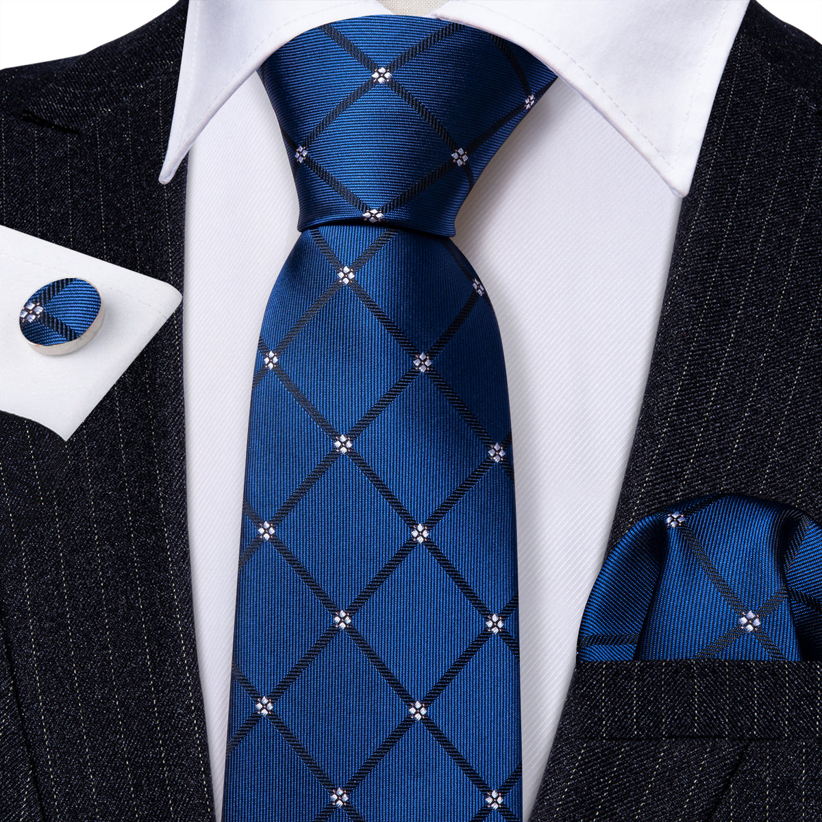 Navy Blue Lattice Tie, Pocket Square and Cufflinks Set