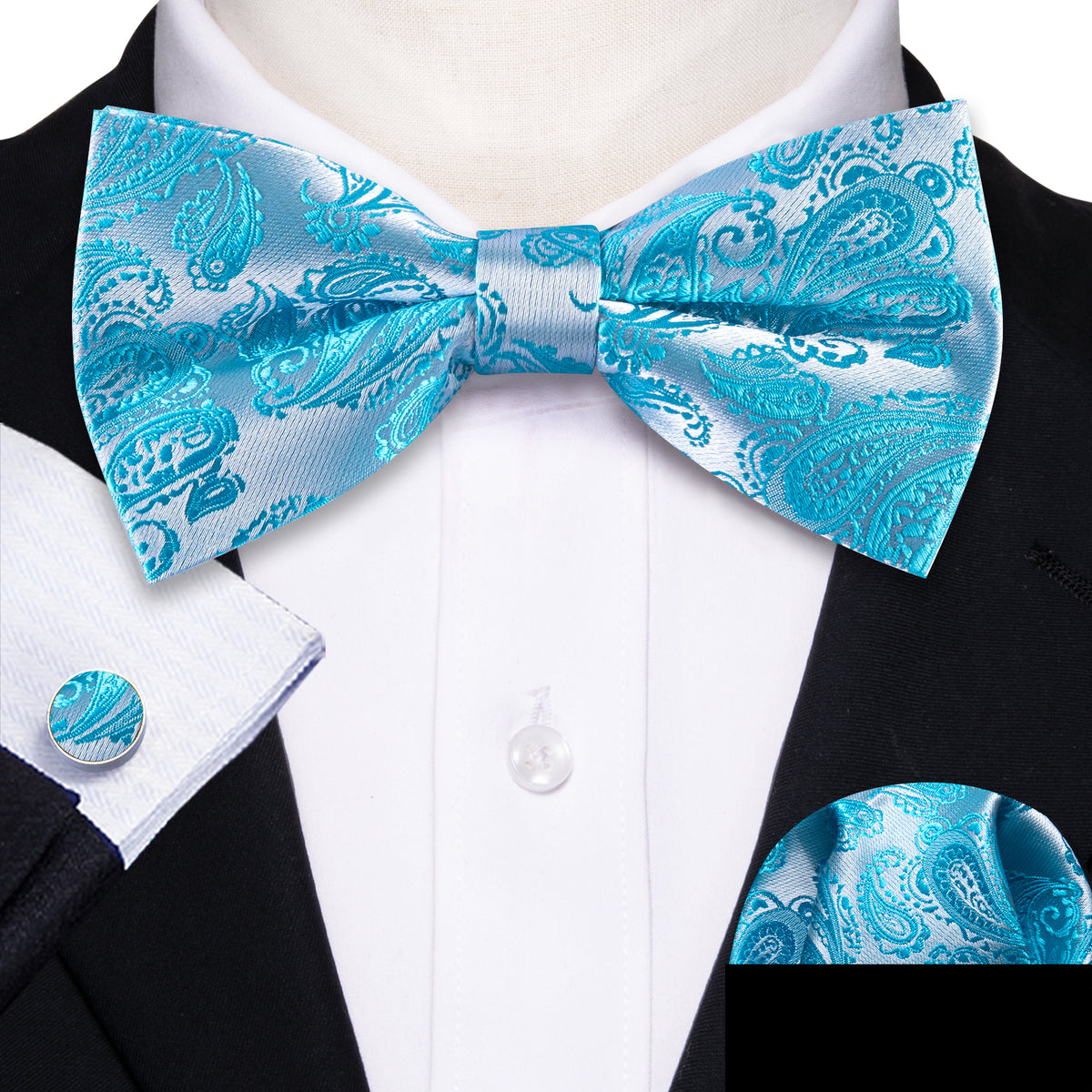 Handcrafted from luxurious silk, this bow tie set includes a bow tie, a matching pocket square, and cufflinks, offering timeless sophistication and a refined look for formal events and special occasions.