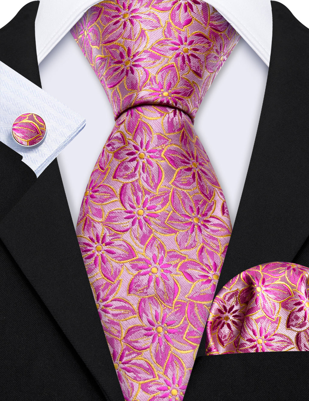 Pink Peach Blossom Jacquard Silk Tie, Pocket Square and Cufflinks Set