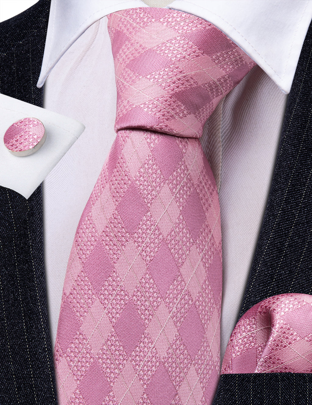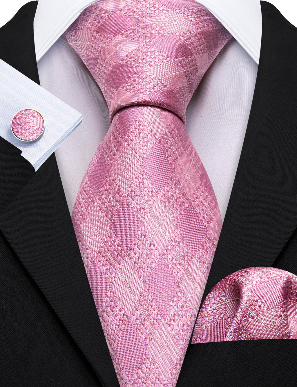 Pink Plaid Silk Tie, Pocket Square and Cufflinks Set