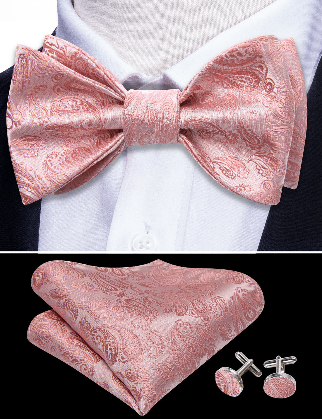 Handcrafted from luxurious silk, this bow tie set includes a bow tie, a matching pocket square, and cufflinks, offering timeless sophistication and a refined look for formal events and special occasions.