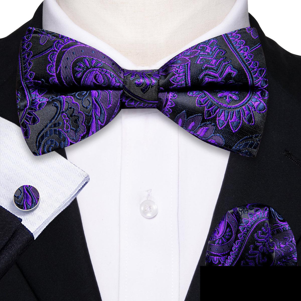 Handcrafted from luxurious silk, this bow tie set includes a bow tie, a matching pocket square, and cufflinks, offering timeless sophistication and a refined look for formal events and special occasions.