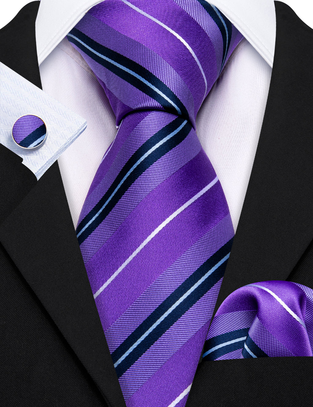 Purple White Striped Silk Tie, Pocket Square and Cufflinks Set