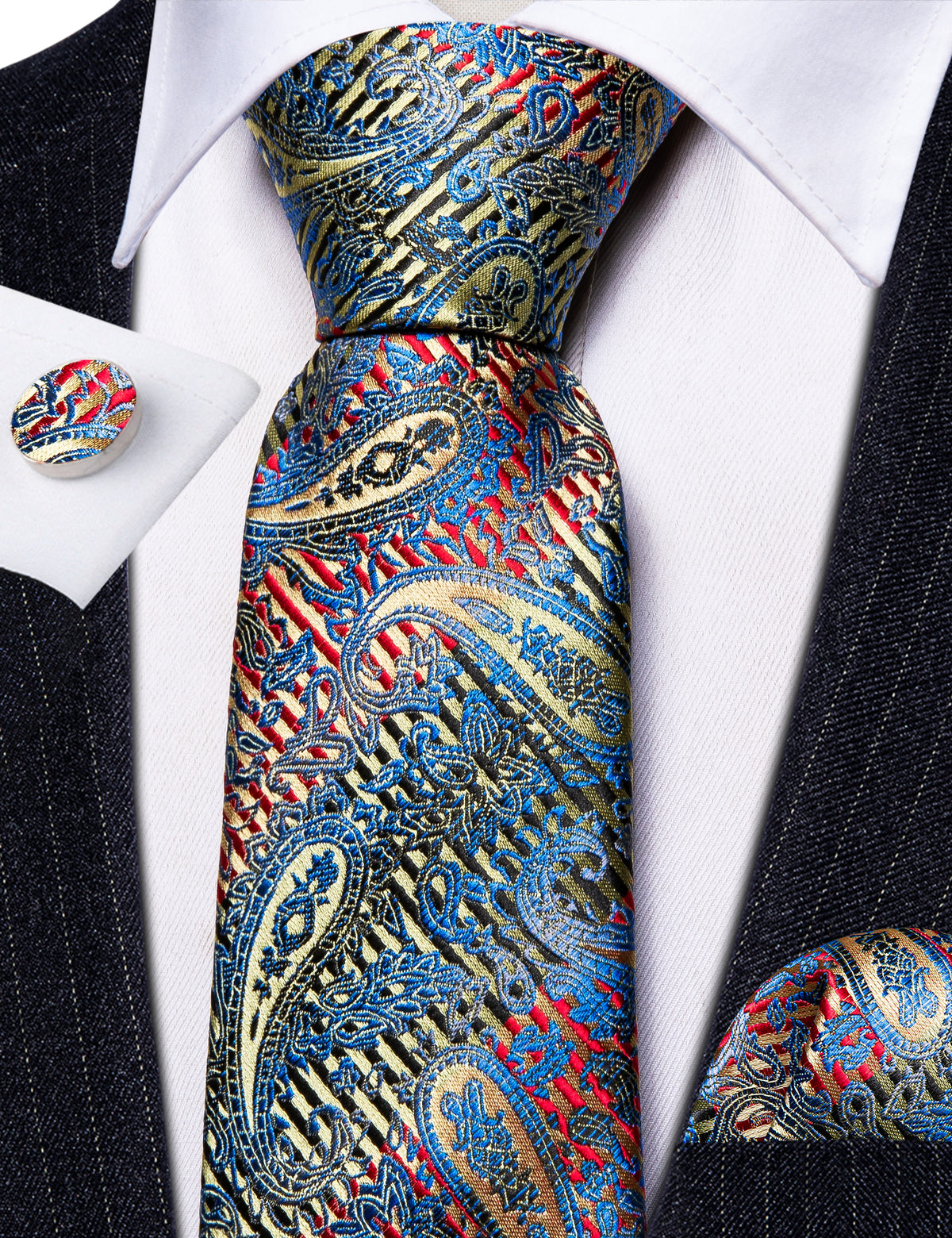 Shining Blue Red Paisley Silk Tie, Pocket Square and Cufflinks Set